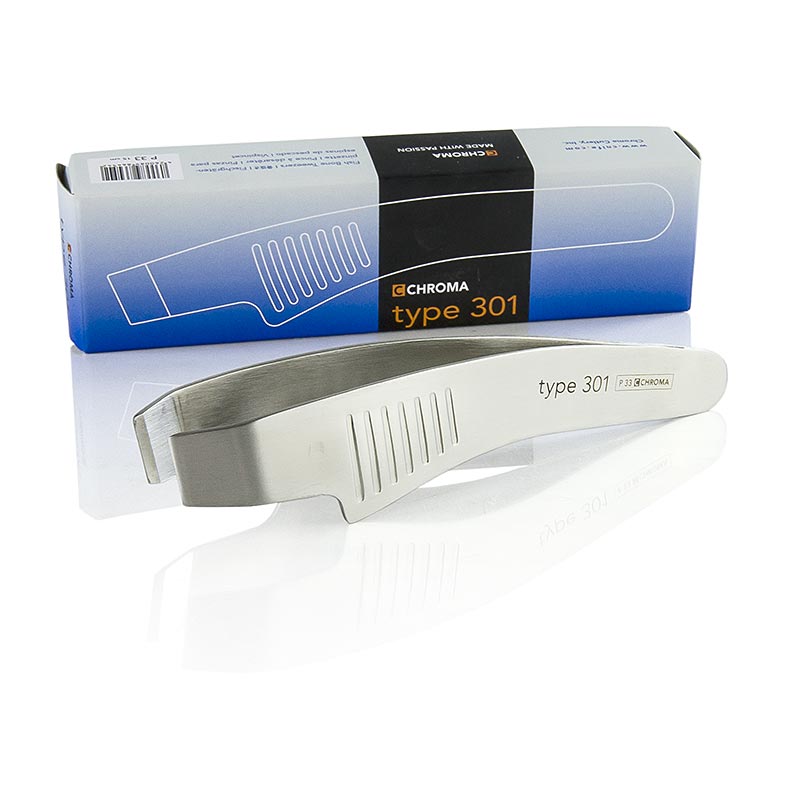Mit dieser Chroma type 301 Profi-Grätenpinzette lassen sich beim Filetieren auch kleinste Gräten ganz einfach greifen und ziehen. Große Schuppen können Sie ebenso mit diesem perfekt verarbeiteten Werkzeug entfernen.