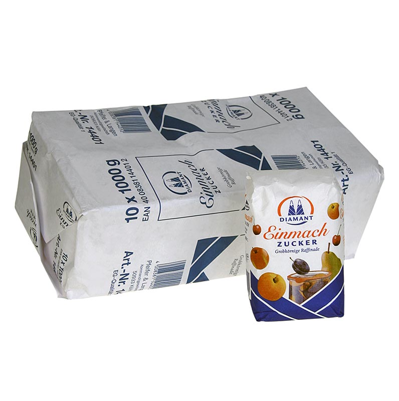 Inhaltsstoffe/Produktinformation: Zucker, grobkörnige Raffinade. Zutaten: raffinierter Zucker. Saftreiche Früchte direkt mit Zucker in Gläser schichten, Saftarme (harte) Früchte werden mit Zuckerlösung eingekocht. Hierfür Zucker in Wasser aufkochen und auf die in Gläser aufgeschichteten Früchte aufgießen, bis diese bedeckt sind. Sehr harte Früchte: wie bei harten Früchten verfahren, jedoch Früchte je nach Bedarf in Zuckerlösung vorkochen. Befüllte Einmachgläser je nach Obstsorte bei +75°C-+90°C über 25-30 Minuten einkochen. Beerenobst (saftreich): 150g-300g auf 1kg Frucht, Beerenobst(saftarm): 400g-700g in 1l Wasser, auf 3kg Frucht, Kernobst: (saftarm): 350g-750g in 1l Wasser, auf 3kg Frucht, Steinobst (saftarm): 200g-70g in 1l Wasser, auf 3kg Frucht. Produkt aus Deutschland.Eigenschaften: Es müssen keine Nährwerte angegeben werden.