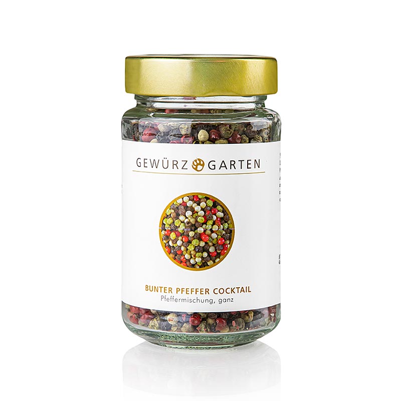 Inhaltsstoffe/Produktinformation: Bunter Pfeffer Cocktail. Zutaten: Pfeffer schwarz, Pfeffer weiß, Pfeffer grün, Schinusbeere (rosa Beere). Kühl (maximal +25°C), trocken und lichtgeschützt lagern. Ursprung: Nicht-EU.Eigenschaften: Es müssen keine Nährwerte angegeben werden.