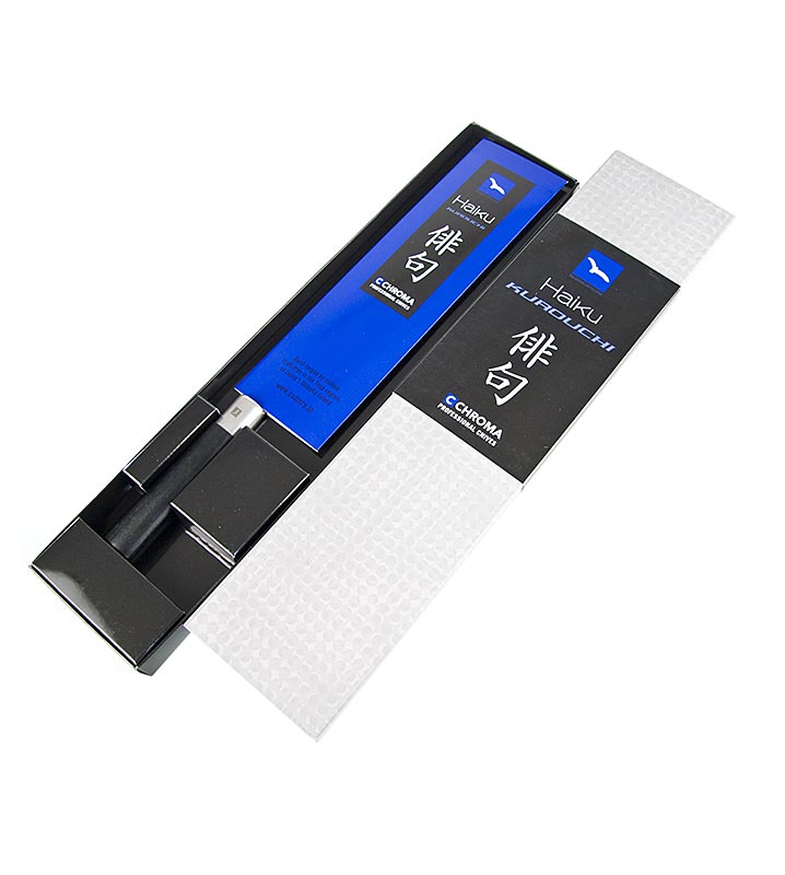Haiku Kurouchi Messer gehören zu den sogenannten Takumi Messern. Takumi bedeutet "Meister". Höchste traditionelle Handwerkskunst, Eleganz sowie hochwertigste Materialien vereinen sich in diesen Kochwerkzeugen. Die Besonderheit der Kurouchi Messer liegt in den Klingen, die "schwarz geschmiedet" werden und so einen "Ur-Messer" Charakter erhalten. Der Klingenkern besteht aus besonders hartem blauen Aoko Stahl, der zur besseren Flexibilität und Stabilität mit weicherem Eisen ummantelt ist. Die sehr flach ausgeschliffenen Klingen, mit 61 Grad Rockwell Härte, sind extrem scharf und garantieren eine sehr lange Standzeit der Schneide. Griffe aus schwarz lasiertem Magnolienholz und Edelstahlzwingen vollenden diese außergewöhnlichen Messer.